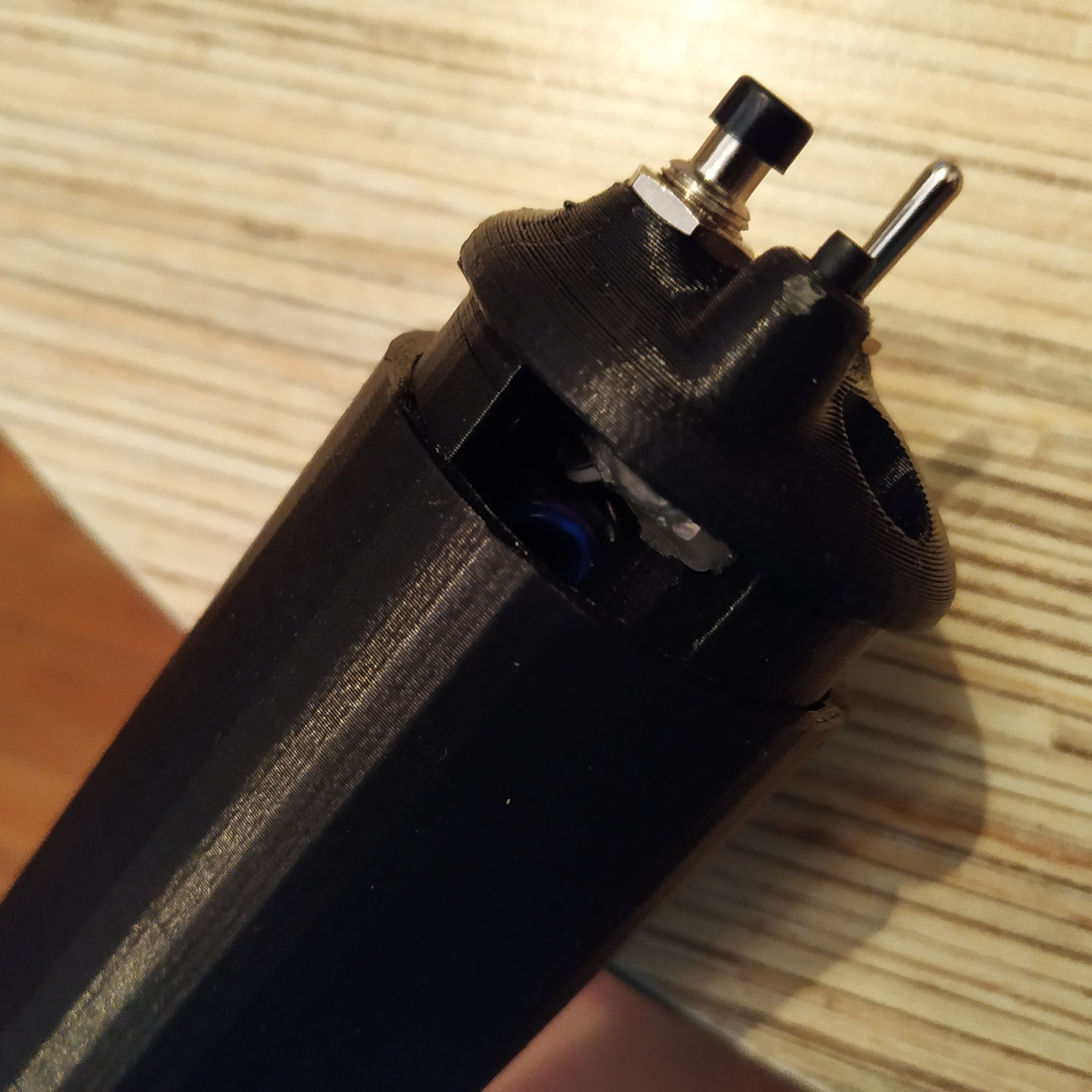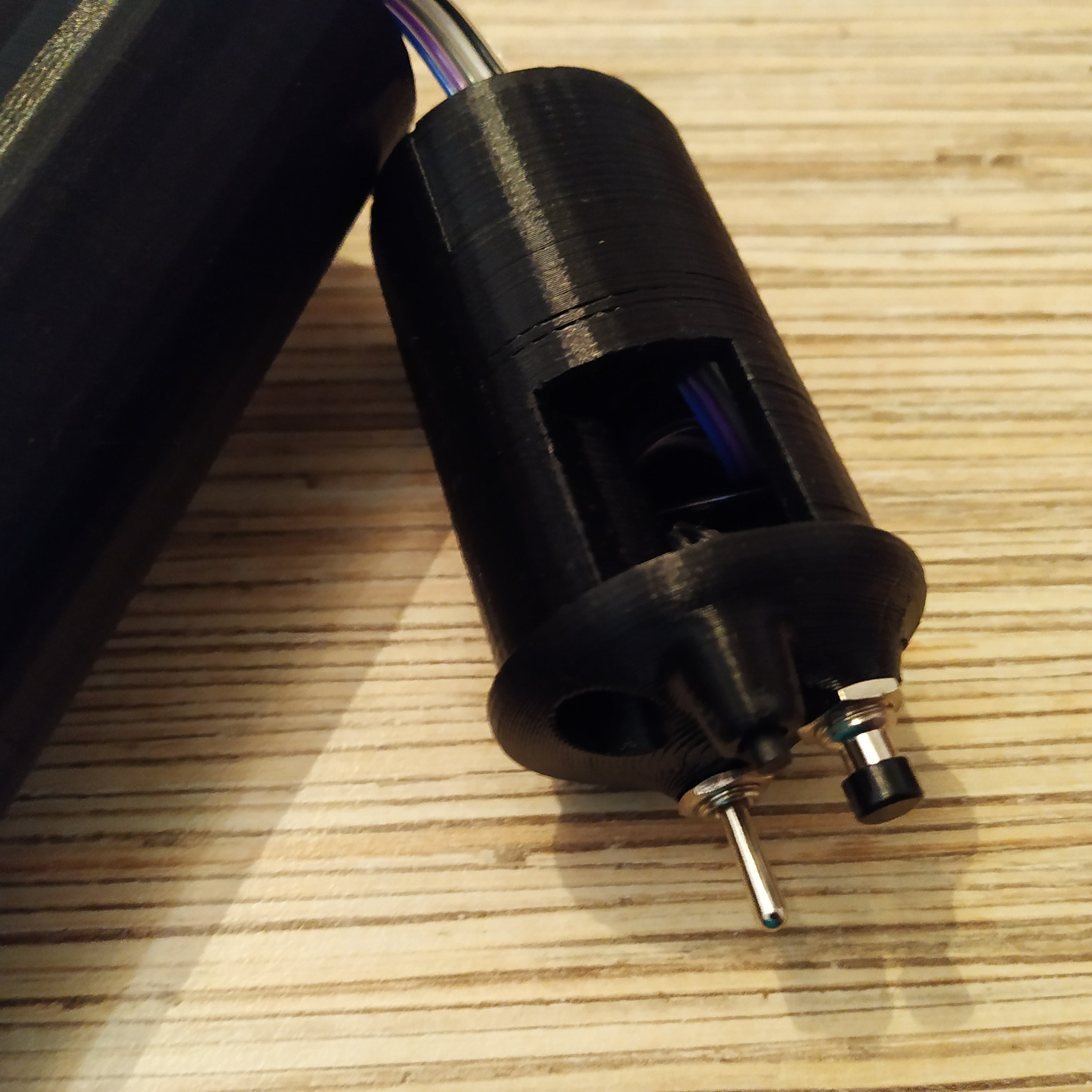5. Fit buttons and the switch into their sockets in the head. Use pliers, screwdrivers, etc to accomplish that. Glue the tact button with some hot glue. Pull the 5-wire cable in a management window as shown in the corresponding picture below.
