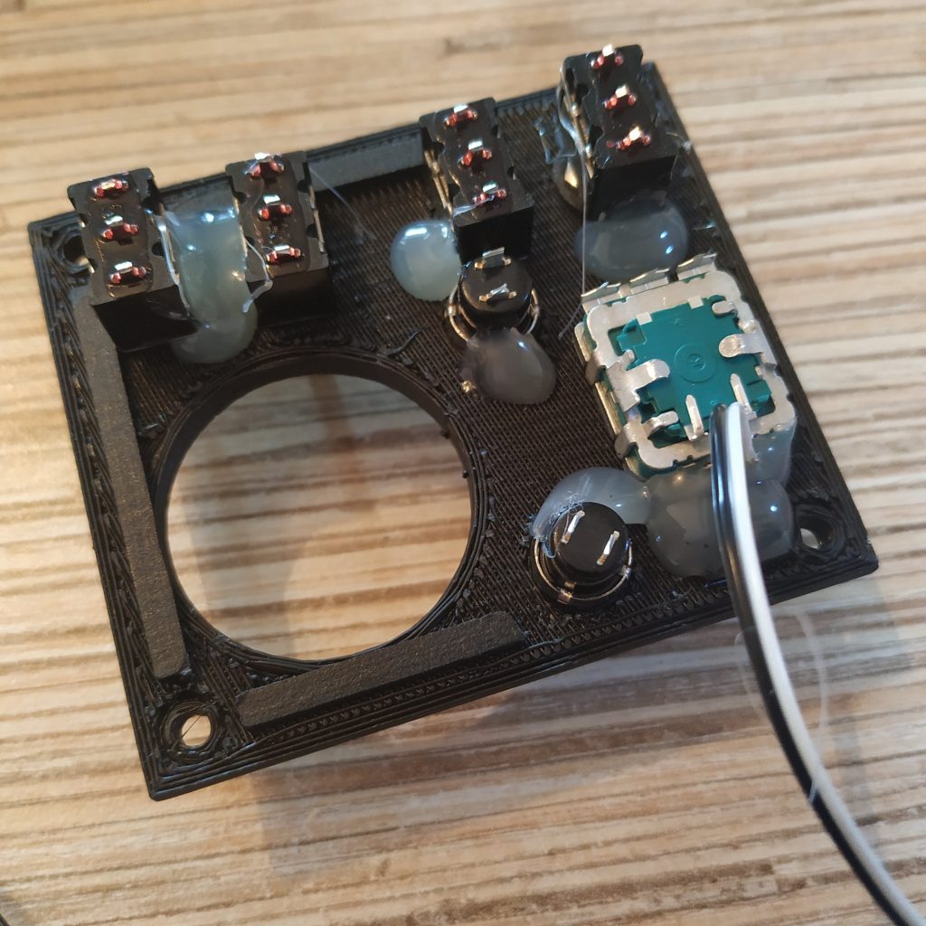 7. Solder the ground wire to all switches and buttons, including 2 pins (one of two pins at the bottom and the middle pin at the top) of the encoder. Note that there's an error on the 1st pic - the GND wire of the pot should be soldered as shown on pic 3!