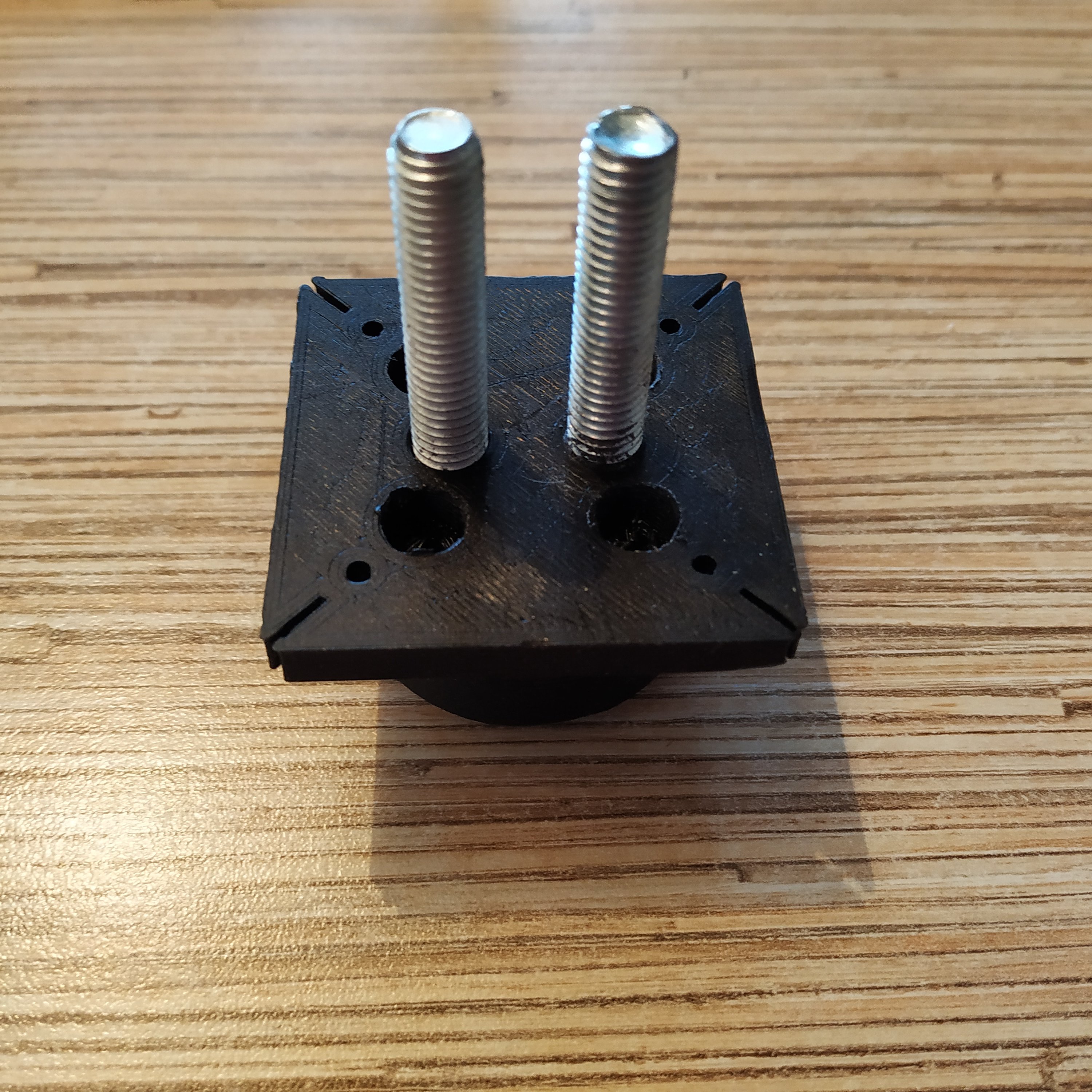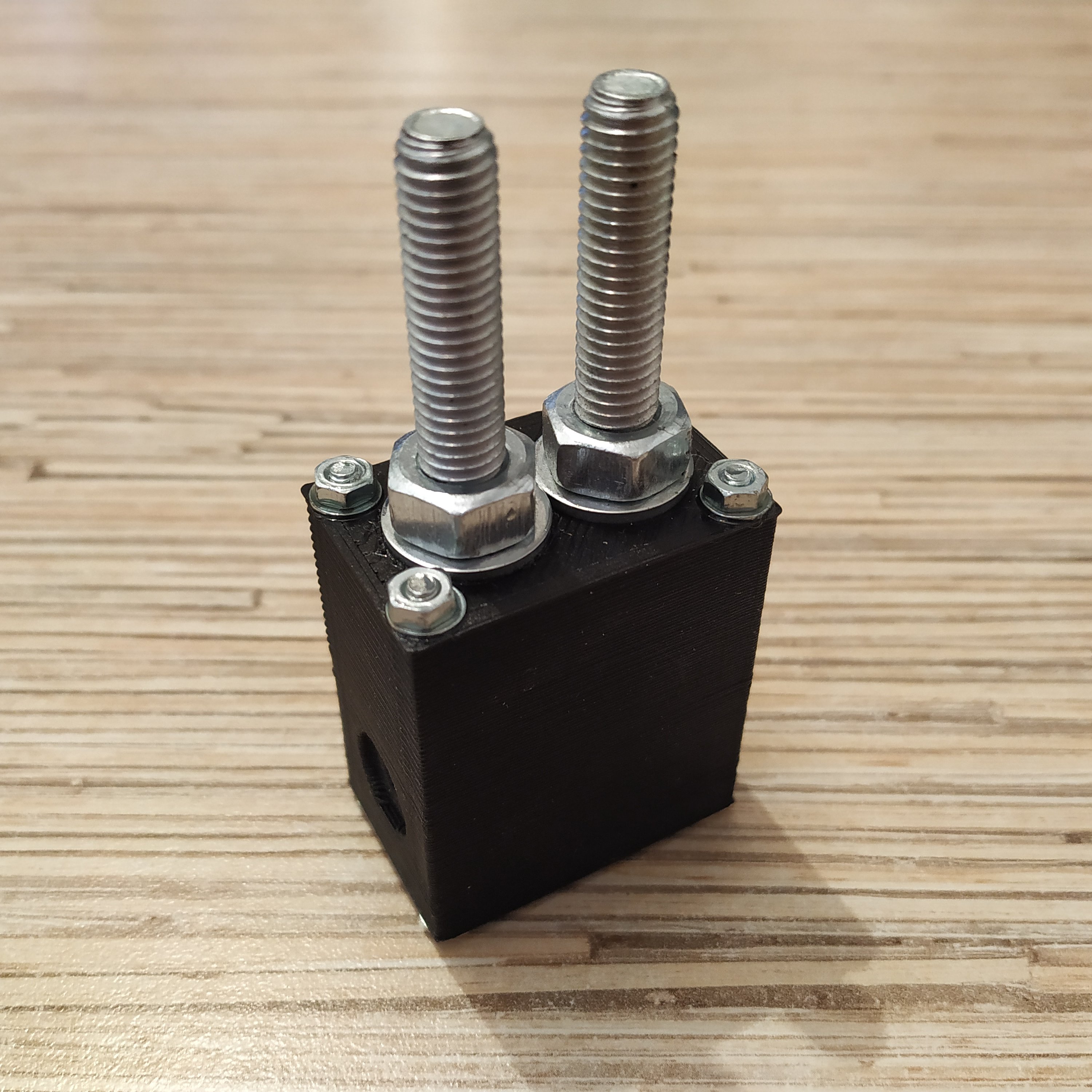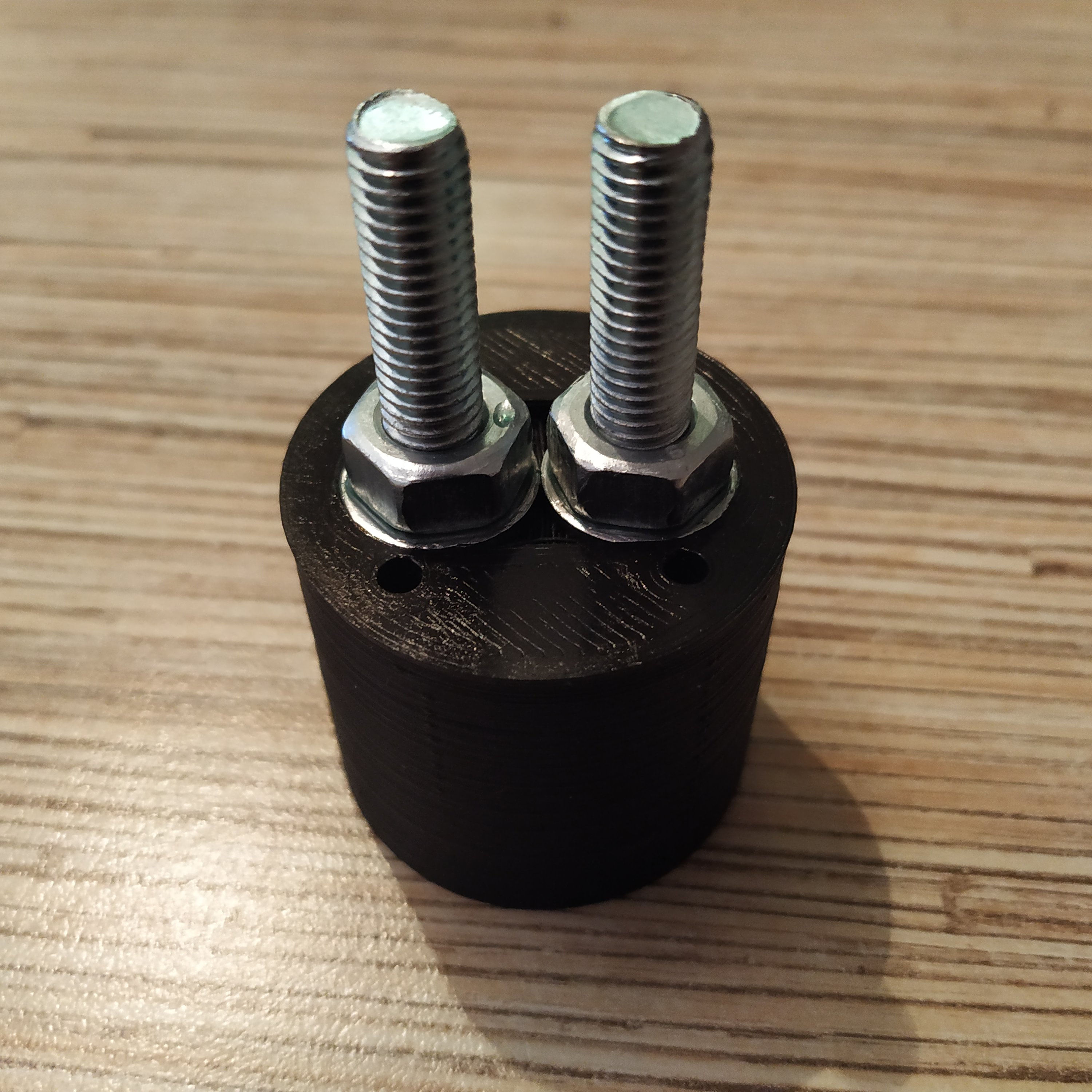 17. Using the provided printable drilling guide and an M4 nut press-fitted into it, drill holes in 4 M8x50mm bolts as shown in the picture below, and put nuts onto those bolts. While drilling, rinse the drilling guide with a bolt inserted in it with cold water often - the process will be much easier. Use moderate RPM of the drill to not let the drill guide to overheat.