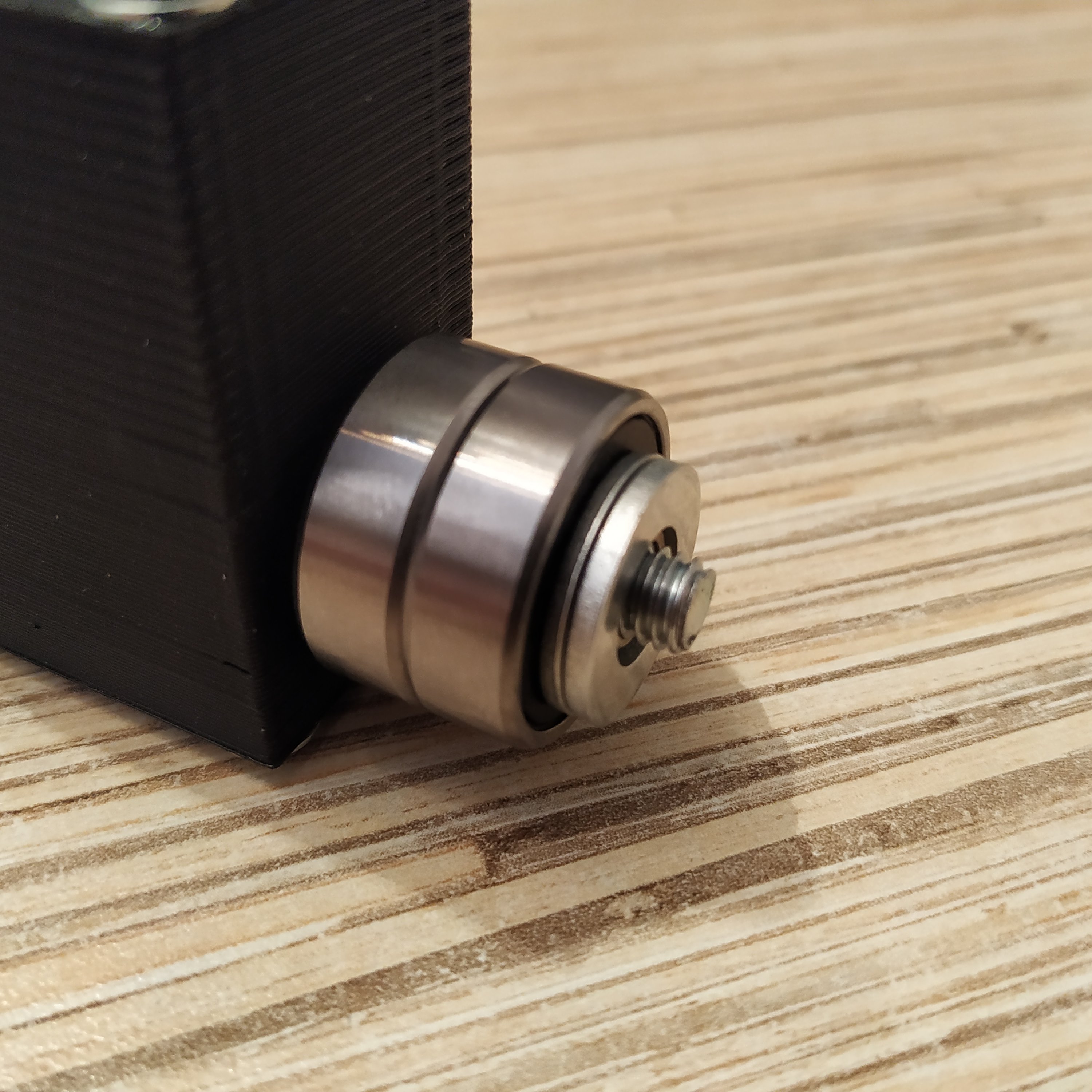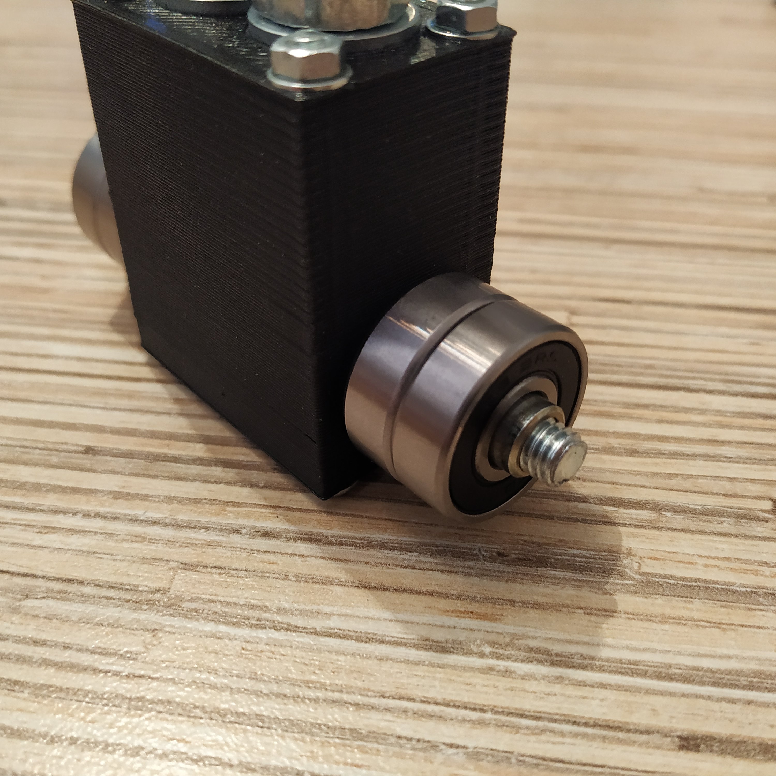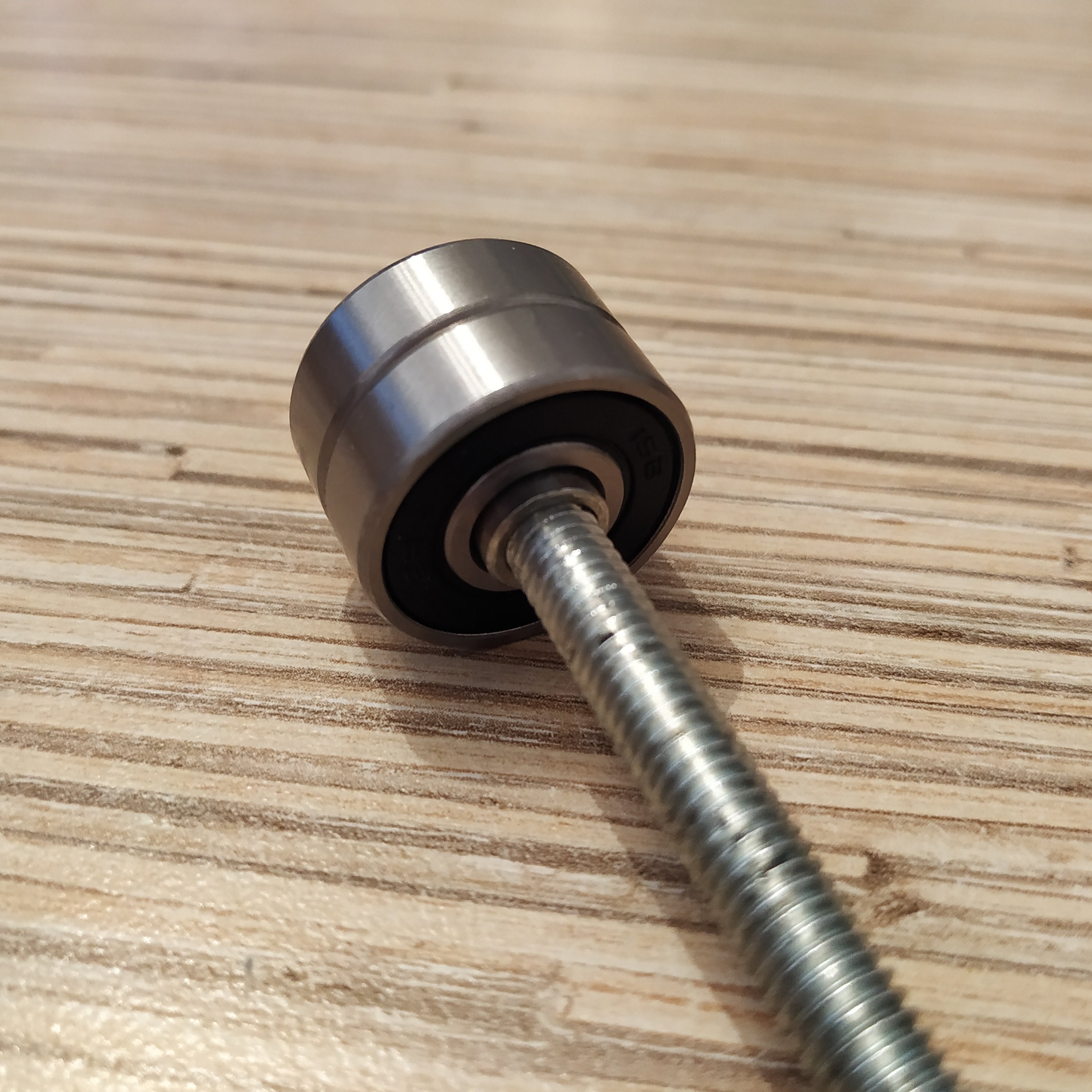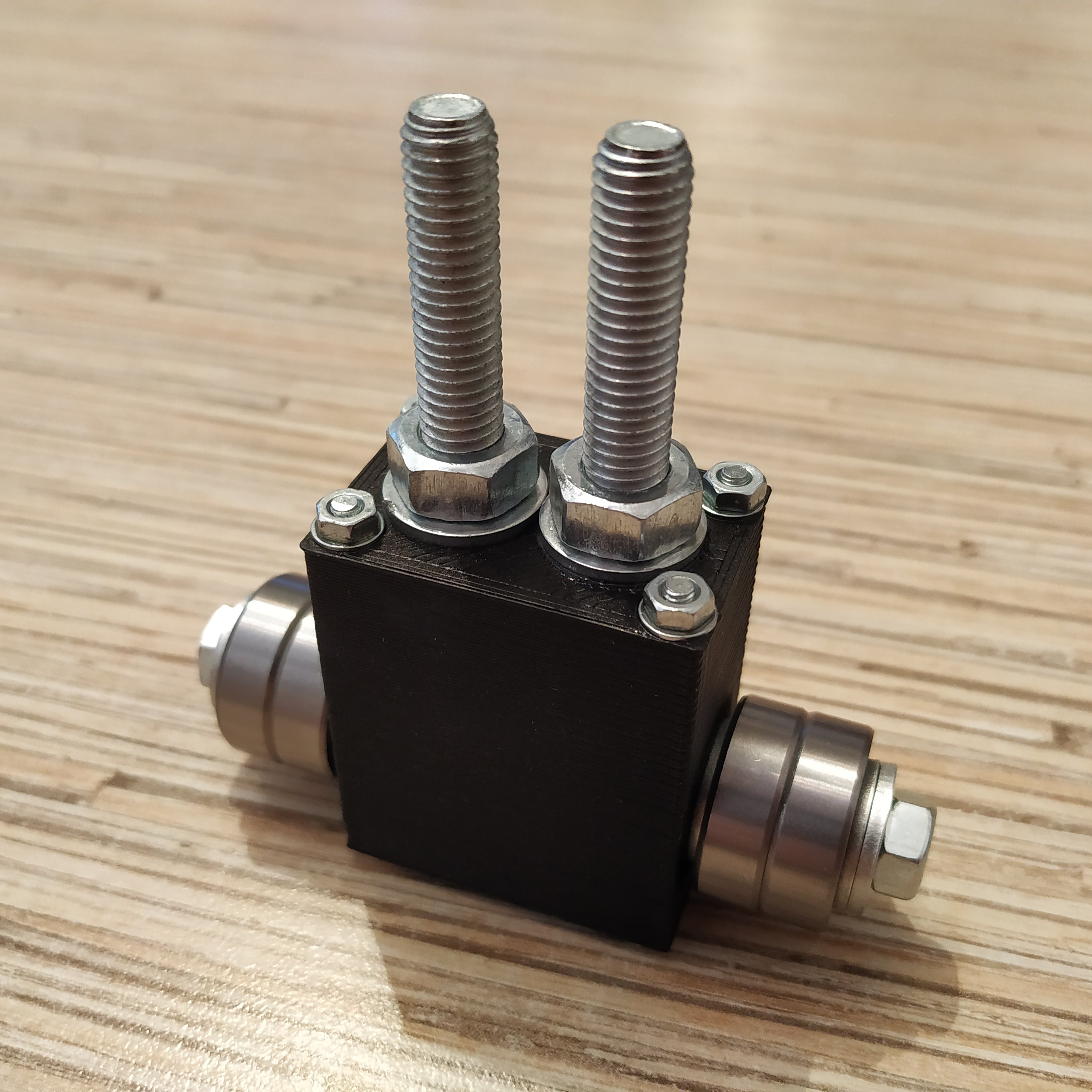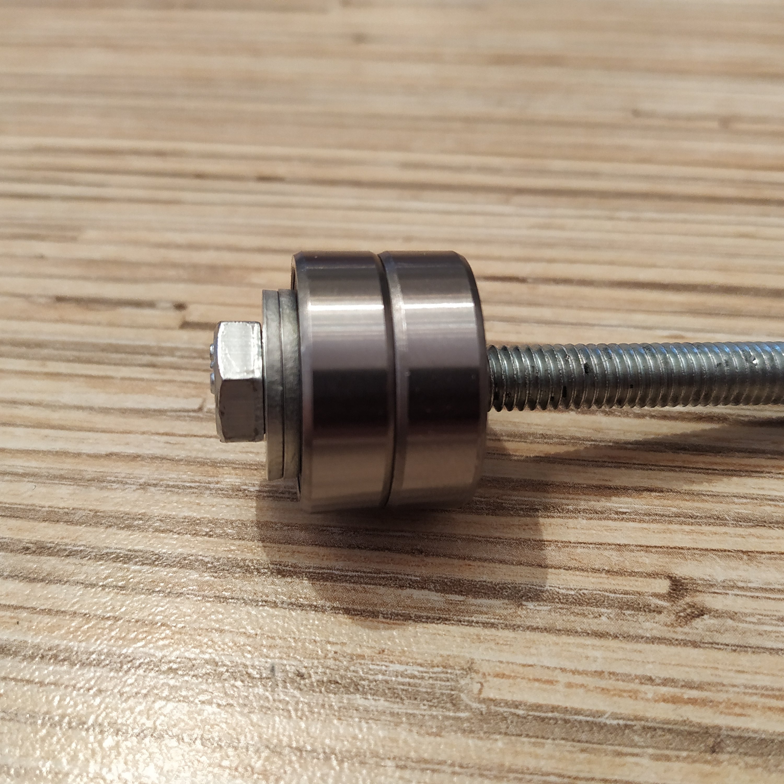 3. Take an M6x80mm bolt and put a 18x6x8mm cylinder onto it. Add 2 M8 washers and 2 608ZZ bearings. Add a M8 washer after bearings. Add another M8 nut after you'll put bearings on.