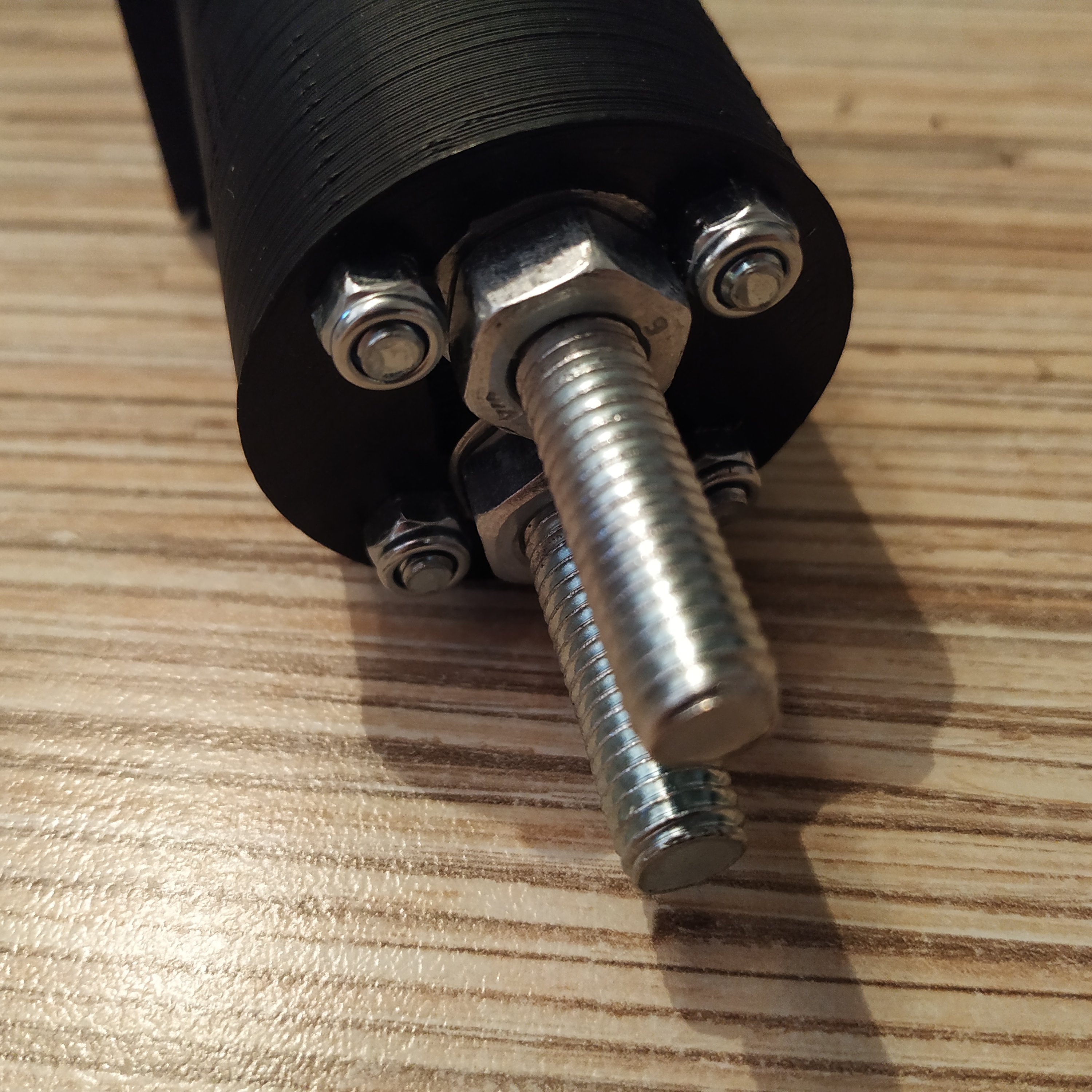 7. Take an M6x40mm bolt, fit a reinforced M6 washer onto it, then another one, the cylinder, 2 bearings,3 (4 on the magnet side) M8 washers, 2 M6 nuts and fit this axis assembly into the inner ring of the gimbal. Repeat the process for the second one. Do not tighten axes yet.