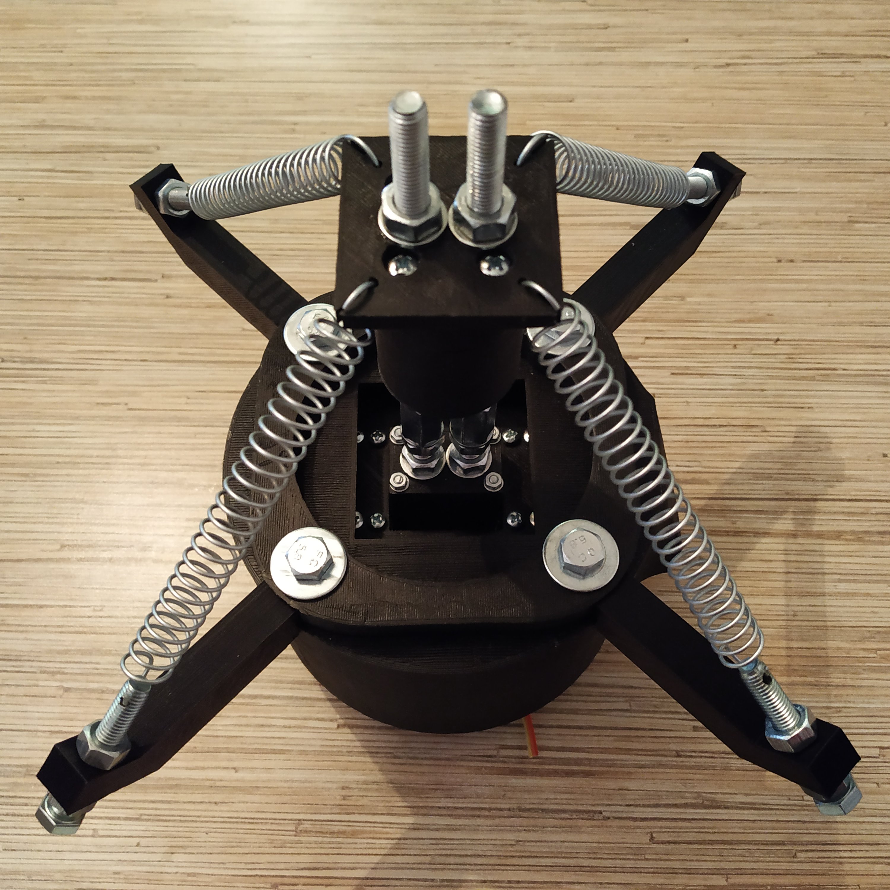 15. Put the spring holder assembly together, put it onto the box. Put gimbal rings assembly into the box and fix everything together with M8x140mm bolts. Put a washer, a spring washer and a nut on each bolt.