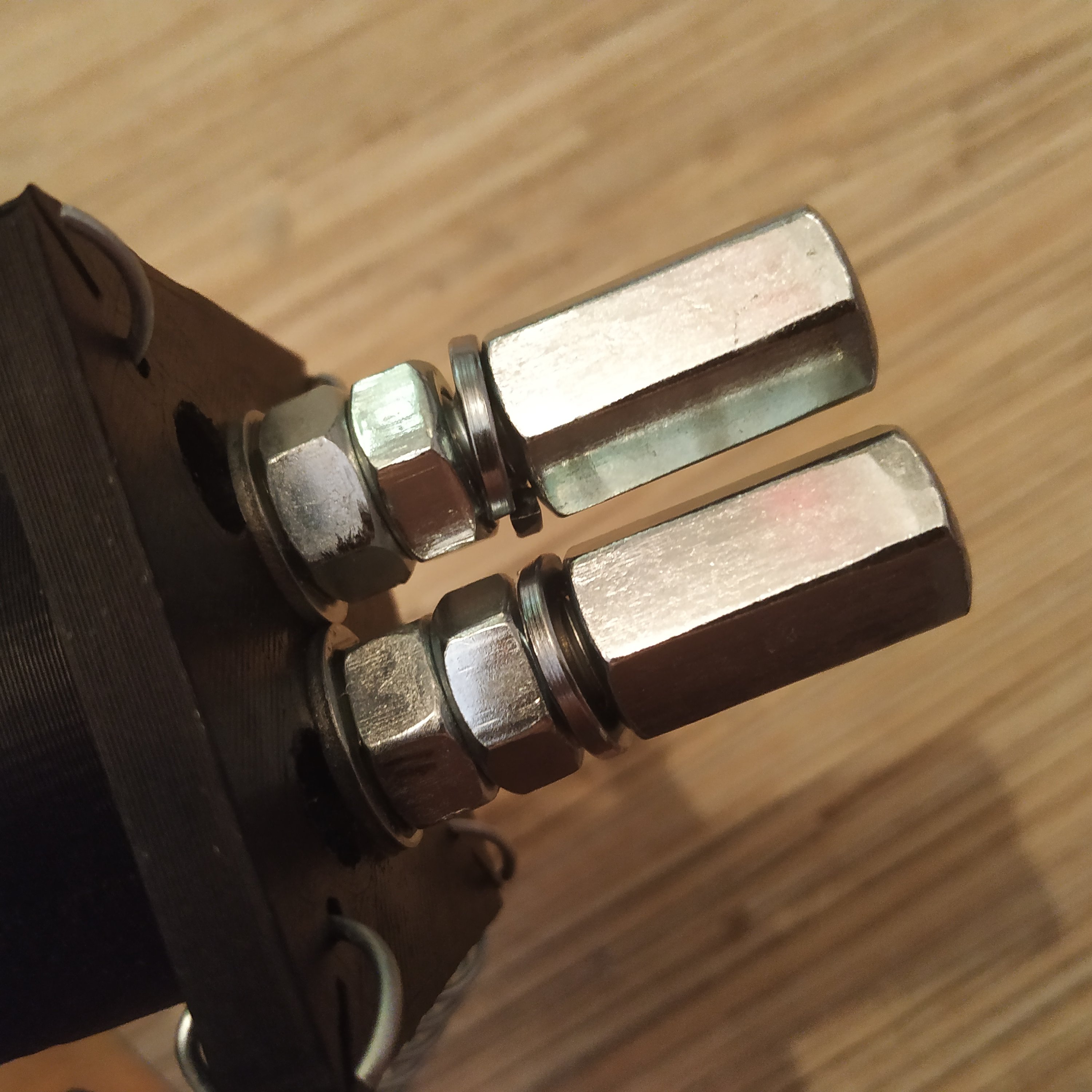 13. Press-fit 2 M8x50mm hex bolts into lever connector part 3. Put 2 washers and nuts on. Use thread locker.