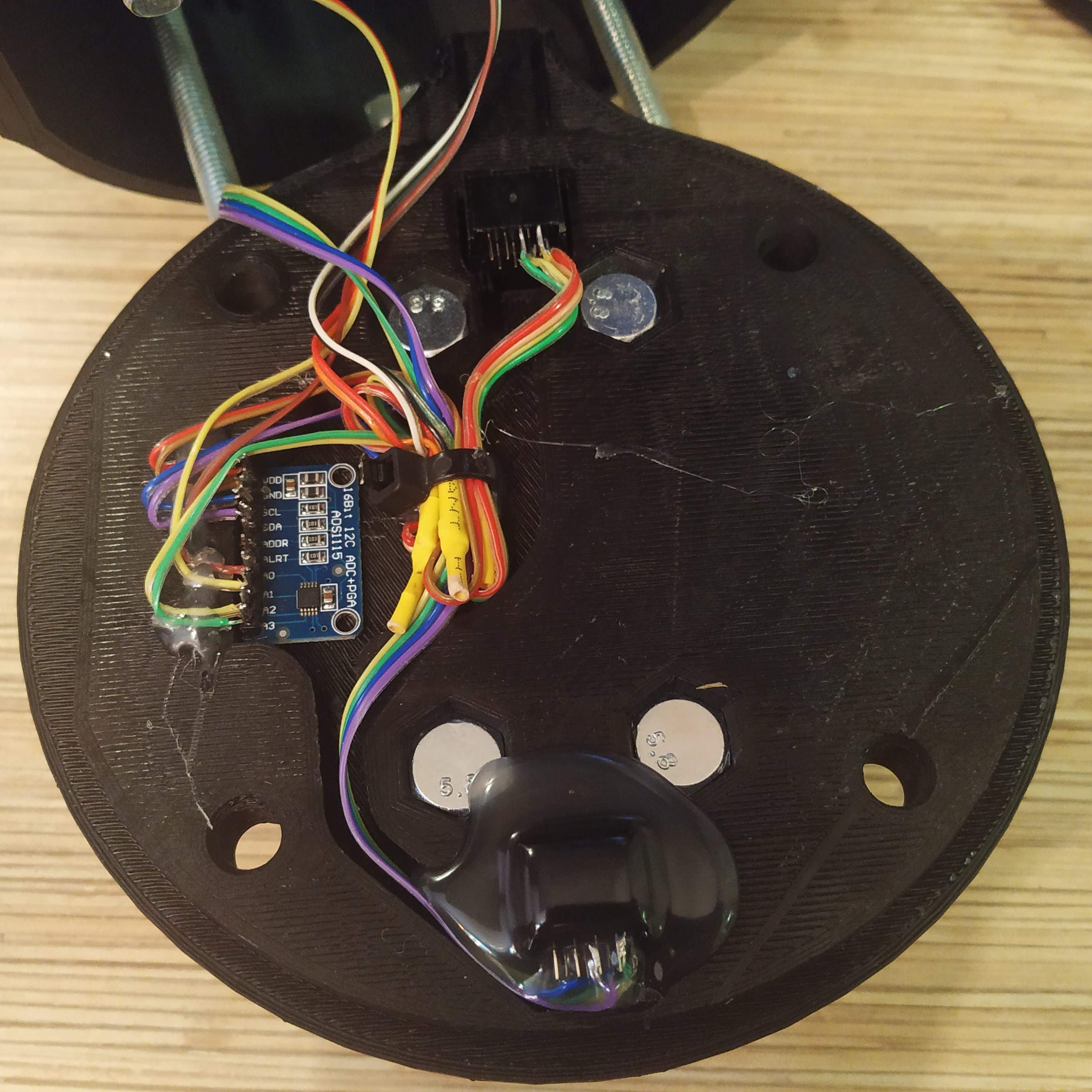 26. If everything works, fix sockets and the ADC board with hot glue and put the lid on. Fix it with 4 nuts, use regular washers along with spring washers. Below are some pictures of cable management from another build that are better than the original ones. Make sure there are cable joints for each wire group, and only 1 wire goes from each joint to the corresponding ADS pin. The result will look much cleaner and will be more reliable then if you try to solder the joint directly to the pin.