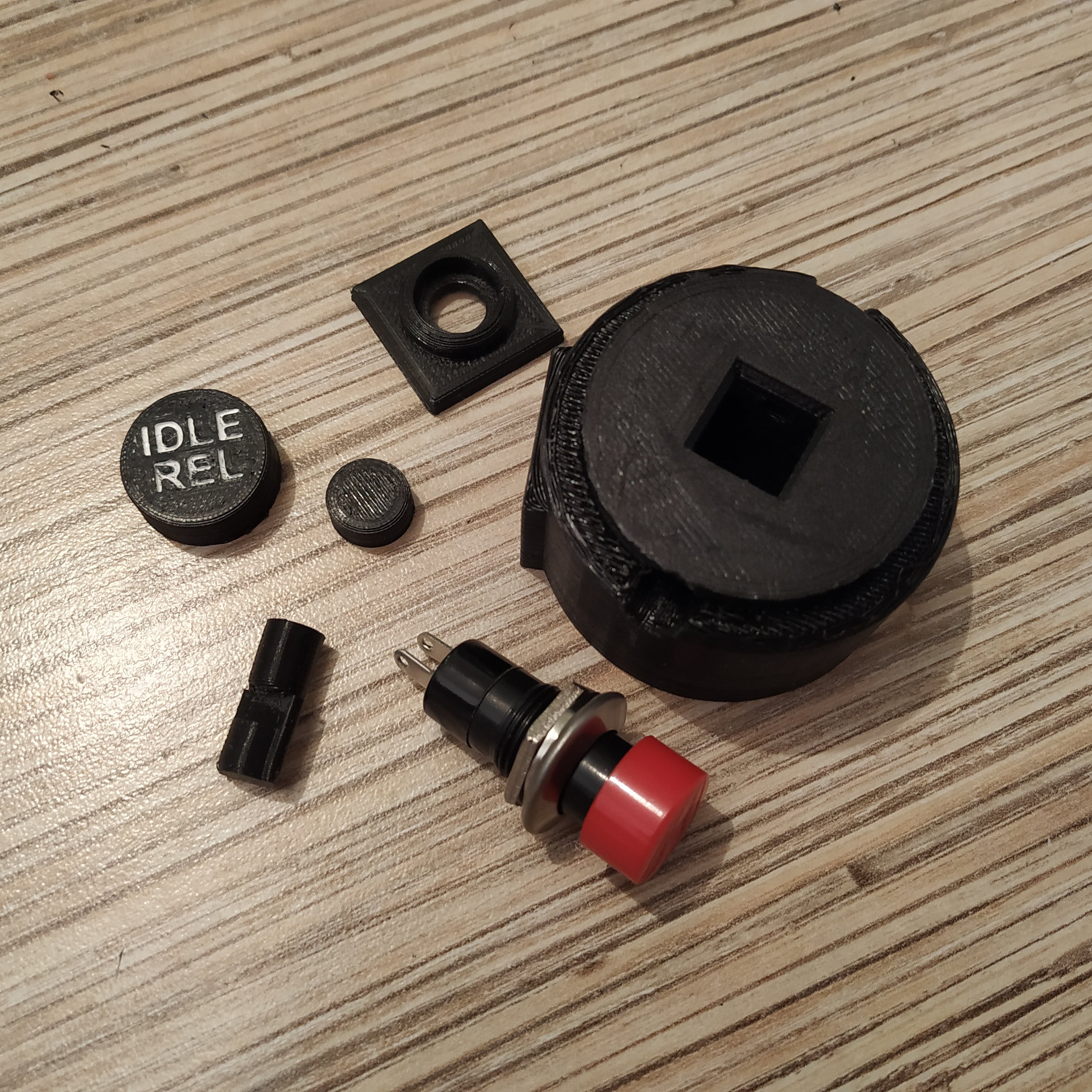 13. We will be using the physical throttle latch mod for this build. To assemble the modified I2C cable housing part, we will need a PBS-16B button, as well as printed parts from the mod folder. Please note, that the latch pin, should be printed with 100% infill.