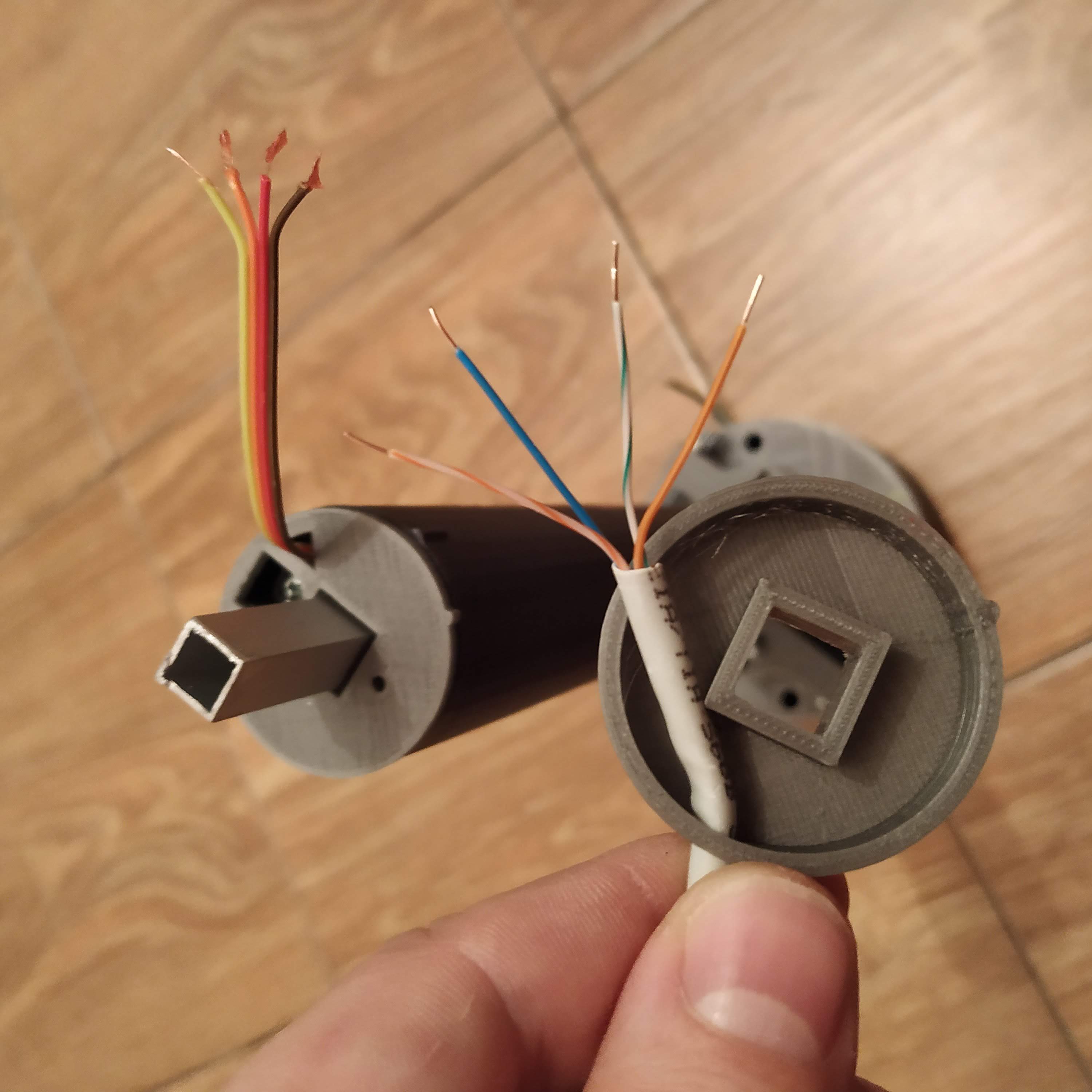 21. Pull a piece of ethernet cable through the I2C connector part, cut and solder I2C ribbon cable wires to it