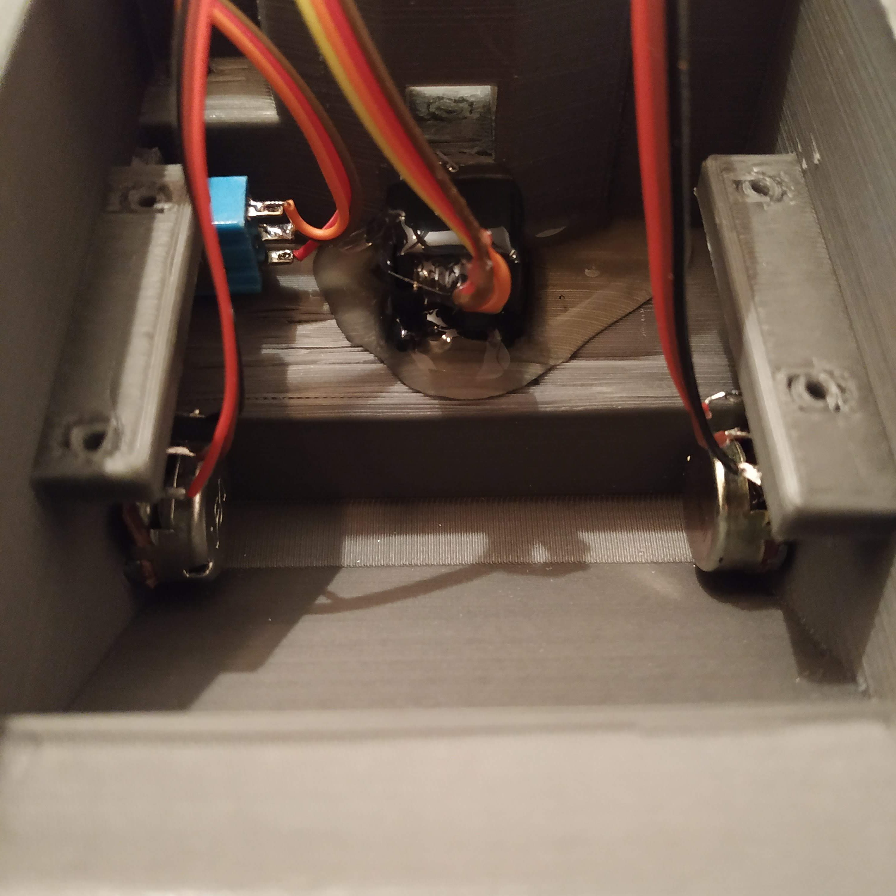 13. Let’s put the stuff into the box. Start with inserting the ethernet socket. Secure it with a fair amount of hot glue. Put rotary pot 1 to the right side of the lever (relative to its normal position in a helicopter), rotary pot 2 to the left side, mode switch facing upwards with wire, connected to A1 pin.