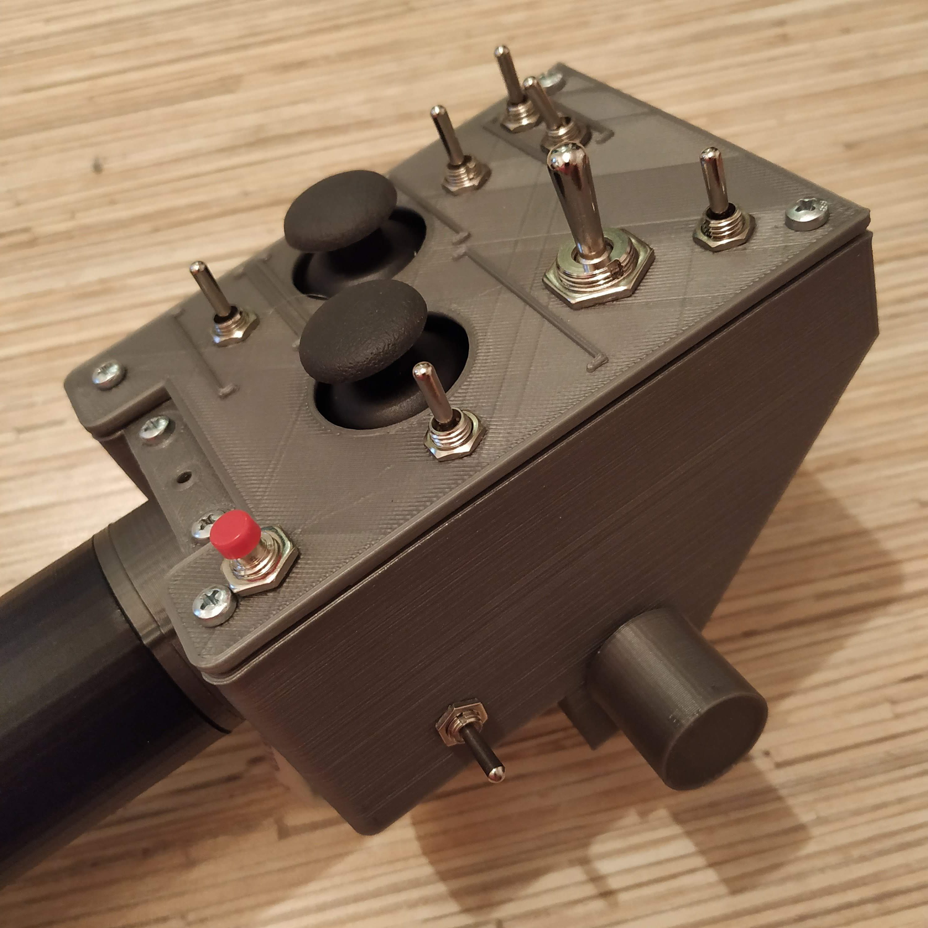 This is the AB412-style collective lever head. It’s not 100% scale, but is close enough and has quite a lot of stuff in it: two Arduino Pro Minis onboard, two hat switches, seven 3-way switches and three buttons on the top panel, and optionally up to two rotary pots on its sides, along with a mode switch. It also has some interesting software-driven features: