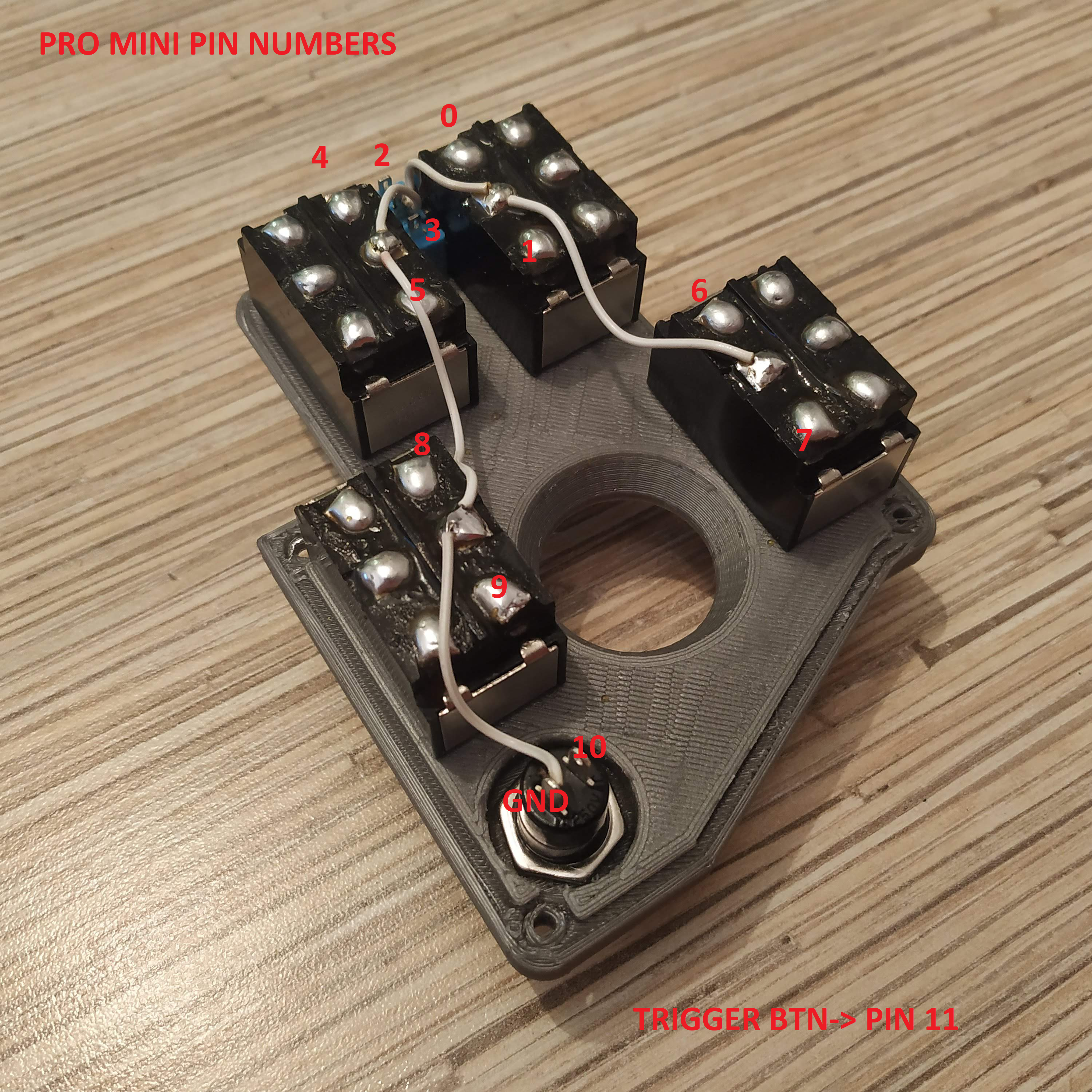 10. Starting from pin0, solder the 12-wire switches cable to the Pro Mini’s digital pins. The wire of the button should go to pin10, and the last wire of the cable should go to the GND pin, near it.